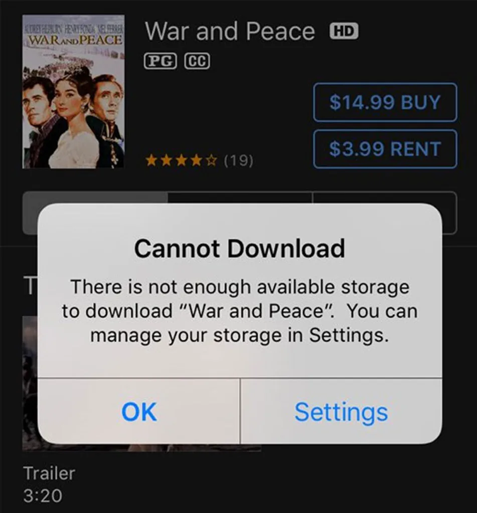 If you have less than 8.86 GB of storage left, go to the iTunes Store and search for the HD version of the 1956 movie War and Peace. Then select the “$3.99 RENT” option.