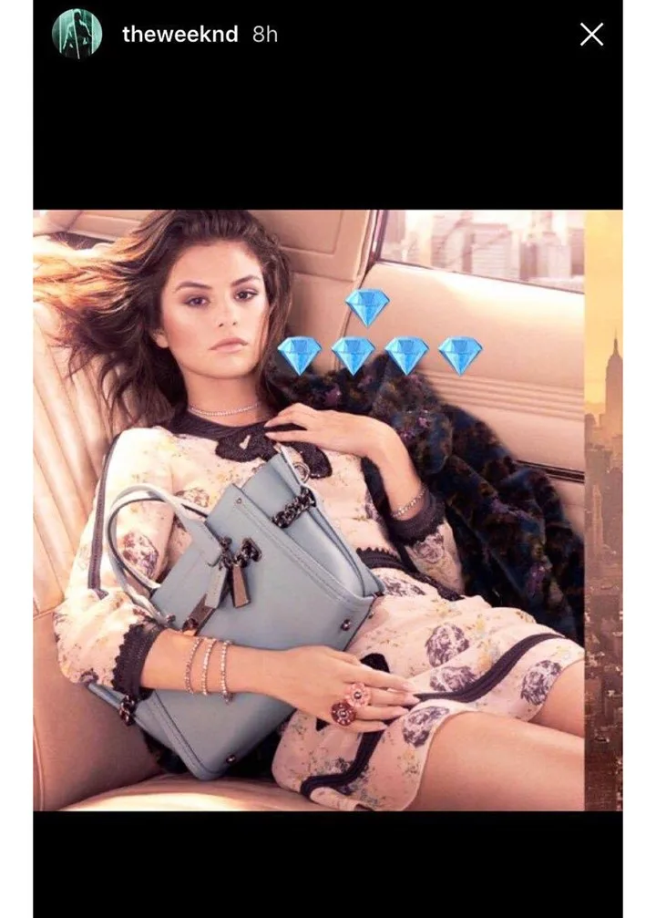 Likewise, when Selena’s first campaign for fashion label Coach dropped yesterday, The Weeknd shared one of her photos. He captioned the image with a series of diamond emojis… you know… because she’s precious to him like a diamond? Yeah you get it.