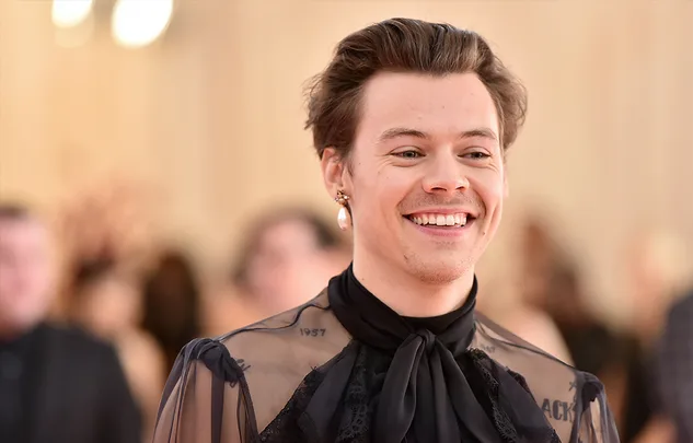 Harry’s gorgeous ensemble is OF COURSE Gucci. The sheer black top features his favourite accessory: a pussy-bow, next to his exposed nipples.